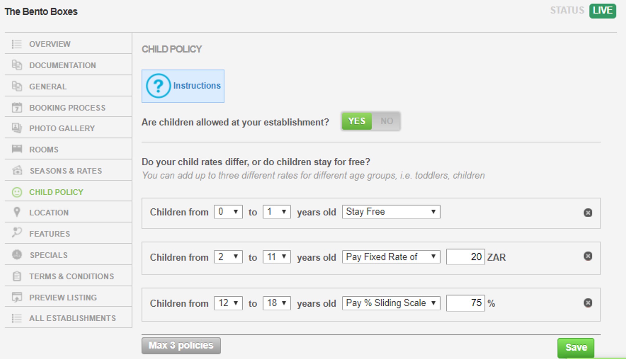2. If you allow children at your establishment, click YES next to ‘Are children allowed at your establishment?’